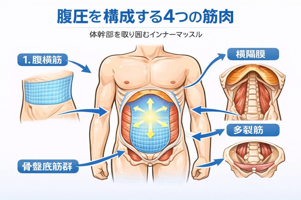 「横隔膜」・「腹横筋」・「多裂筋」・「骨盤底筋群」