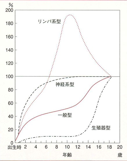 出生時から急速に発育し、12,13歳に成人の約200%にまで発育します。その後、20歳になるにつれて徐々に低下していきます。